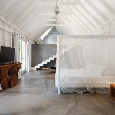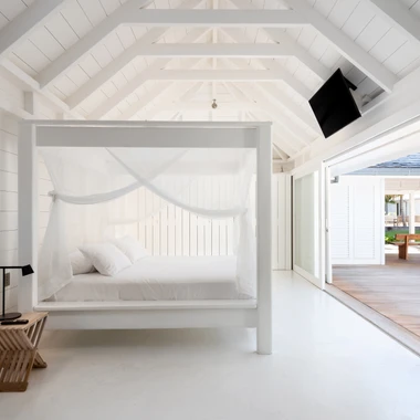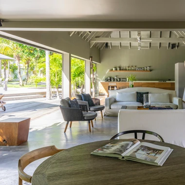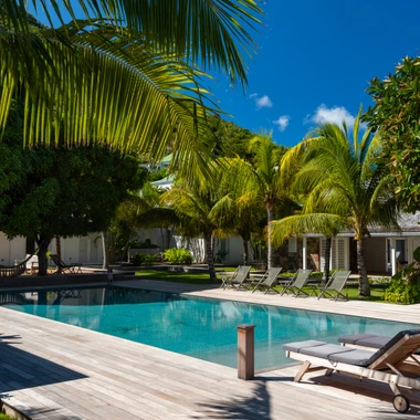The main house and annexes, open to the outside, seem to be one with nature and blend admirably into the lush vegetation. At the center of this garden of Eden, a large swimming pool bordered by palms and a wide teak terrace promises hours of relaxation and idleness between shade and sunlight.